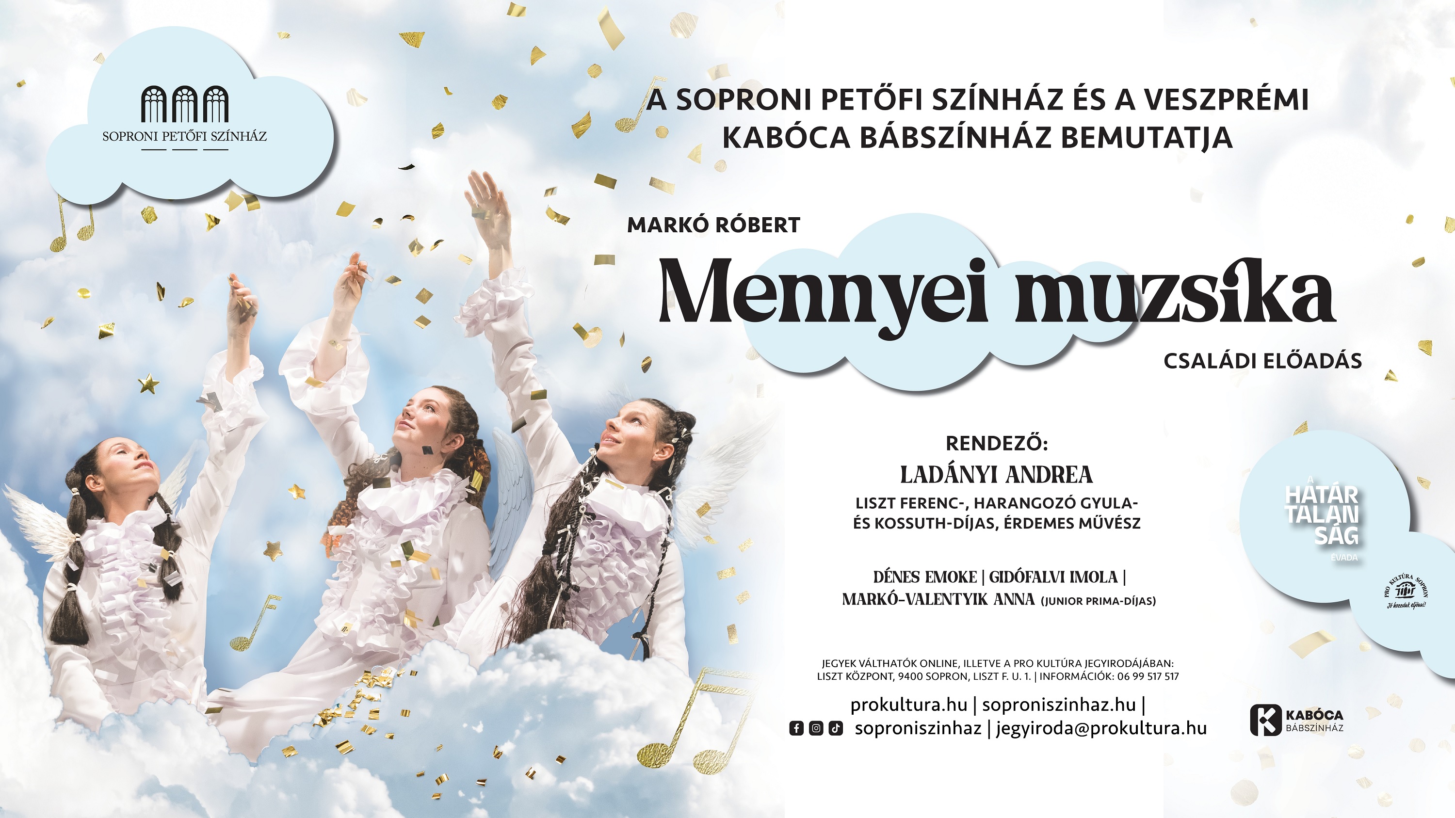 Valamikor az idők kezdetén, az aranykorban, amikor az ég kapui még tárva-nyitva álltak, az emberek a földről benézhettek a nyitott égbe, és hallhatták a bűvös zenét, ami a mennyben szólt. Később azonban az emberek szíve megkeményedett, a fülük bezáródott: nem hallották többé az éteri zenét – és jól megszomorodtak. Amíg egy szép napon három angyal el nem határozta, hogy visszacsempészi a földre a mennyei muzsikát, és vele az emberek szívébe az égi boldogságot... Meghitt és lélekemelő családi színházi előadás szeretetről, megértésről, harmóniáról, költészettel, tánccal, zenével, észak-európai és német népmesemotívumok alapján.